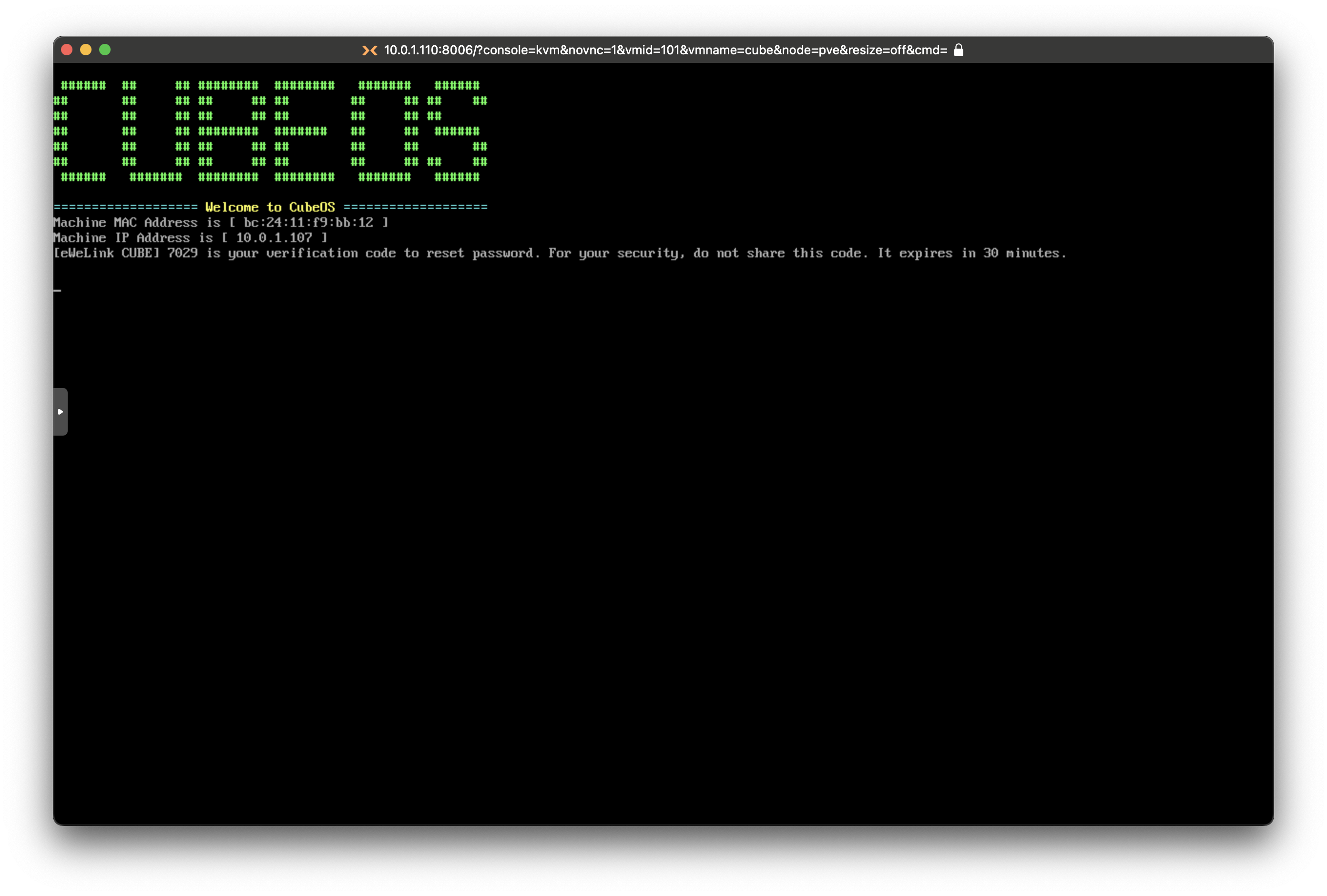 Acceda a la consola backend de CUBE OS mediante el monitor externo o el administrador de máquinas virtuales y busque el código impreso.