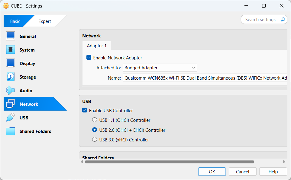 На вкладке «Сеть» настройте подключение как «Сетевой мост (Bridged Adapter)» и выберите используемый сетевой адаптер.