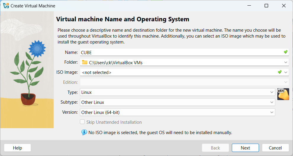 Назовите виртуальную машину, выберите «Linux» как тип, «Other Linux» как подтип и «Other Linux (64-bit)» как версию.