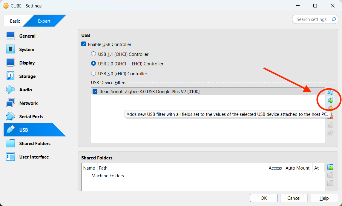 **Дополнительно:** Для использования Zigbee-донгла вставьте его на этом этапе и выберите правильный тип контроллера во вкладке «USB». В фильтре USB добавьте необходимый Zigbee-донгл с помощью кнопки добавления сбоку.