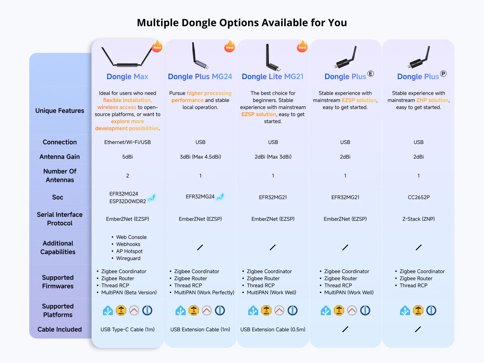 Junto com a equipe da SONOFF, oferecemos cinco modelos de Dongle projetados para diferentes tamanhos de rede Zigbee e necessidades de desempenho: