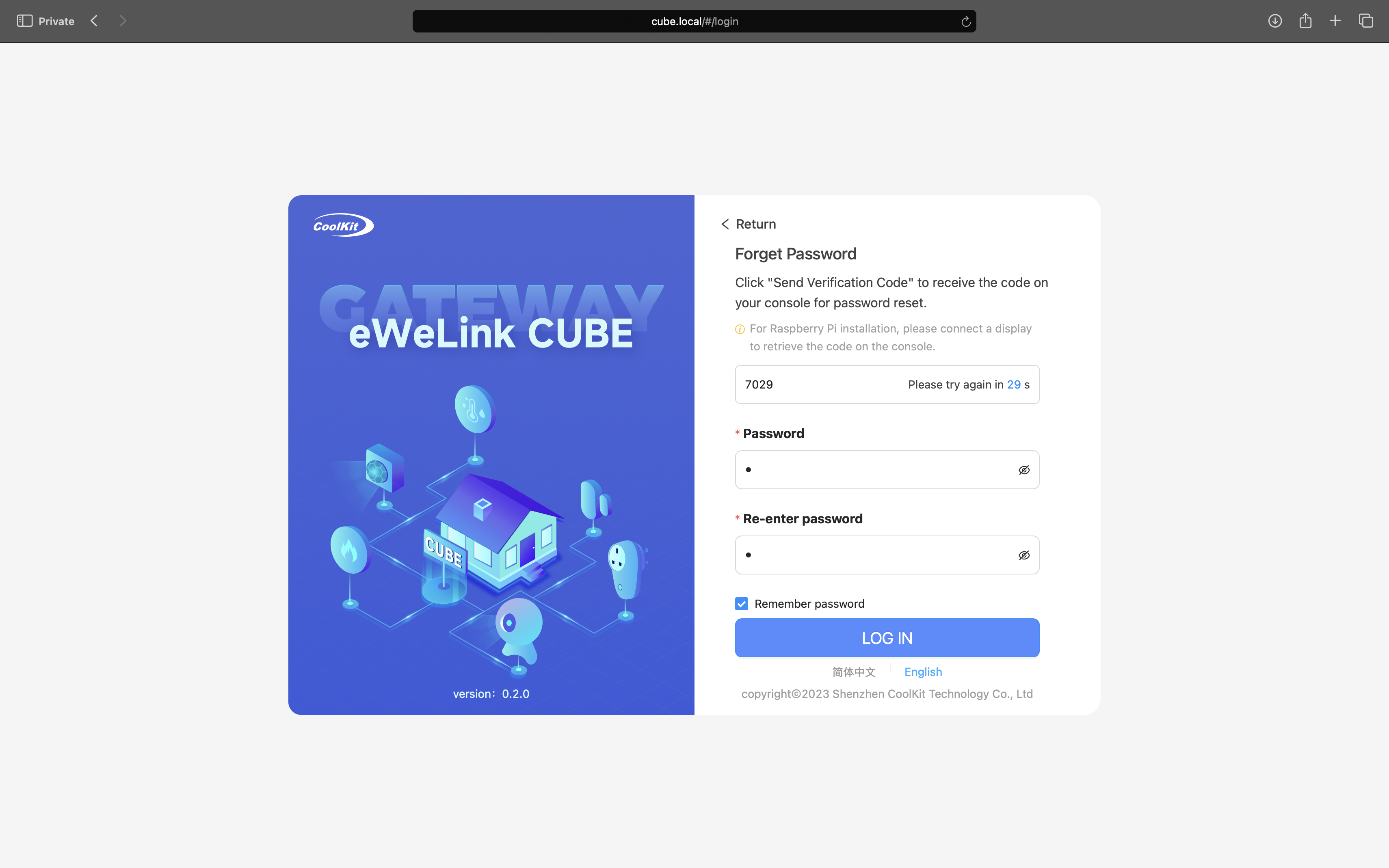 Digite o código no console web do CUBE OS e defina uma nova senha.