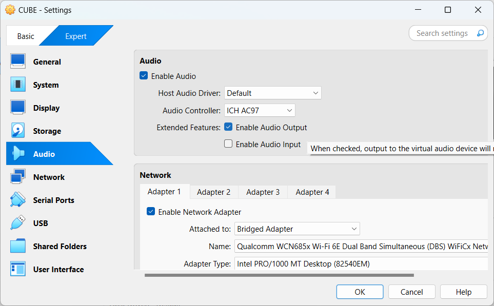 ภายใต้แท็บ “เครือข่าย” กำหนดการเชื่อมต่อเครือข่ายเป็น “Bridged Adapter” และเลือกอแดปเตอร์เครือข่ายที่คุณกำลังใช้