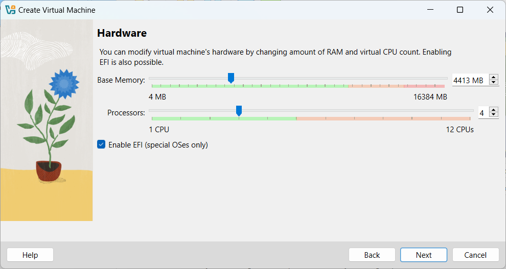 ภายใต้ “ฮาร์ดแวร์” กำหนดขนาดหน่วยความจำและจำนวนโปรเซสเซอร์สำหรับเครื่องเสมือน แนะนำ 4GB หน่วยความจำและ 2 CPU แล้วเปิดใช้งาน EFI